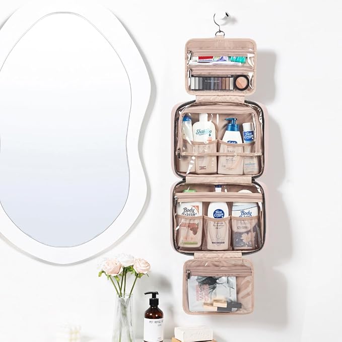 - ESSENTIAL ARRANGEMENT - A hanger to hook allows you to hang the toiletry bag almost anywhere for easy accessibility. Quick-access front pocket for secure storage