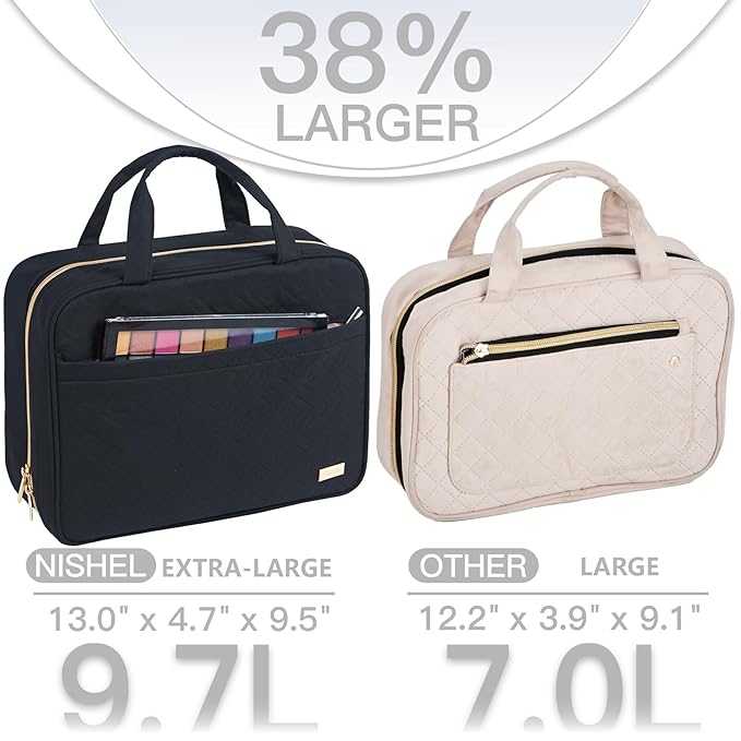 NISHEL Travel Toiletry Bag for women, Portable Hanging Organizer for Family-Sized Shampoo, Conditioner, Brushes Set, Makeup Accessories, Extra Large Size, Black
