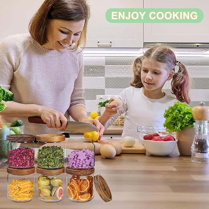 - 【WIDE APPLICATIONS】 Glass kitchen canisters for pantry organization and storage are suitable for storing various dried ingredients to retain their freshness, with clear glass jars, you can easily see inside and quickly find the ingredients you need.Glass jars with wood lids perfect for storing dry food , such as,cookies,dried beans,pepper,oatmeal,jams,chutneys, rice, flour, tea, coffee, biscuits, candy,cheese,flour, sugar, seeds,etc. Keep your kitchen tidy and safe,saving space and convenient .