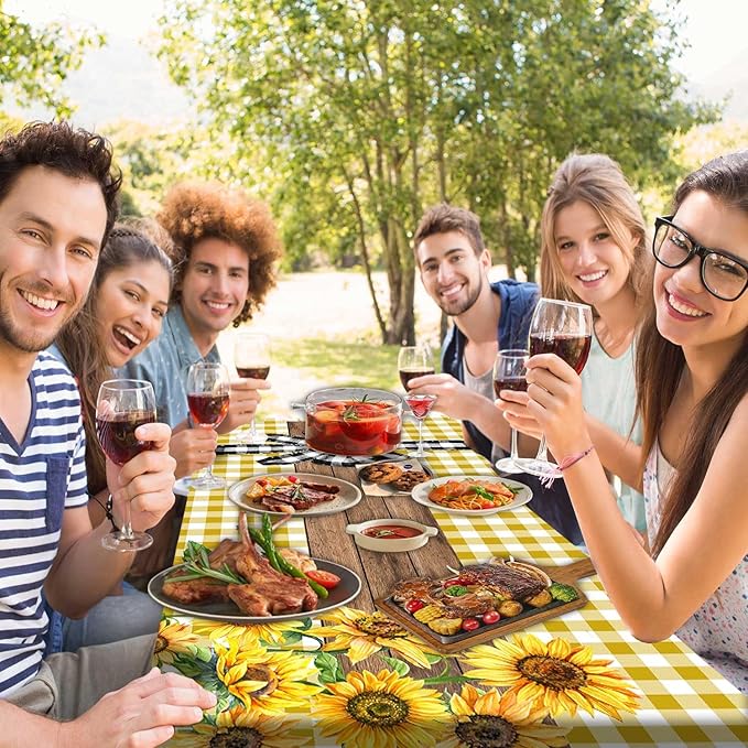 Picnic Table Cover with Bench Covers, Sunflower Buffalo Plaid Farmhouse Wood Waterproof Elastic Fitted Tablecloths Outdoor Camping Essentials, with Drawstring Bag, 96in, Yellow