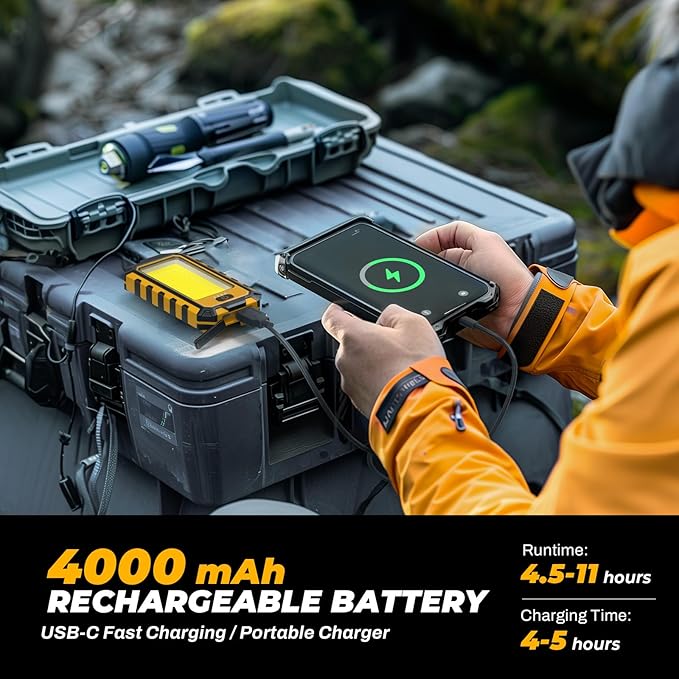 - 【4000mAh Fast Charging & Output】The work light features a built-in large-capacity battery that recharges in just 5-6 hours using Type-C fast charging. Additionally, It includes 4-level power indicators for real-time battery monitoring. This magnetic led light can also charge smartphones and other small devices via the USB-A port.