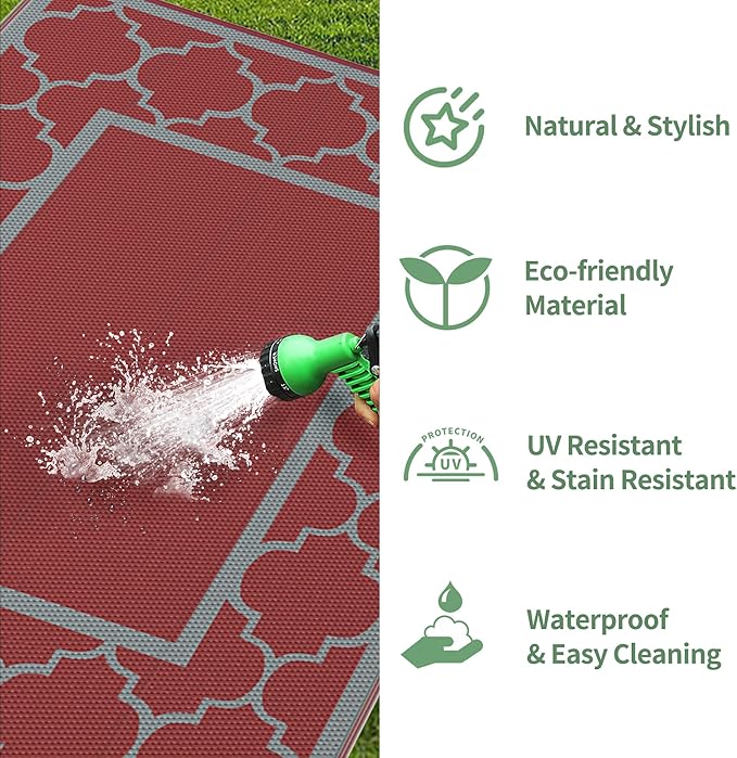 - Upgraded Materials & Reversible Use:GENIMO's outdoor plastic straw rug, crafted from recyclable polypropylene, features eye-catching patterns and is fully reversible. Waterproof and durable, it's an ideal choice for patios and outdoor relaxation, especially as part of your camping essentials. Thanks to the upgraded weaving process, whether used on one side or the other, it seamlessly integrates with the outdoor environment, bringing joyful moments