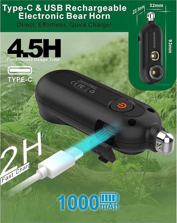 - 【1000mAh Battery & USB-C Charging】Powered by a robust 1000mAh battery with convenient USB-C charging. Delivers 4 hours of continuous bear-scaring alarm per full charge. Quick 30-minute charge = 1.5 hours of use. Flashing low-power light ensures your bear horn is always trail-ready.