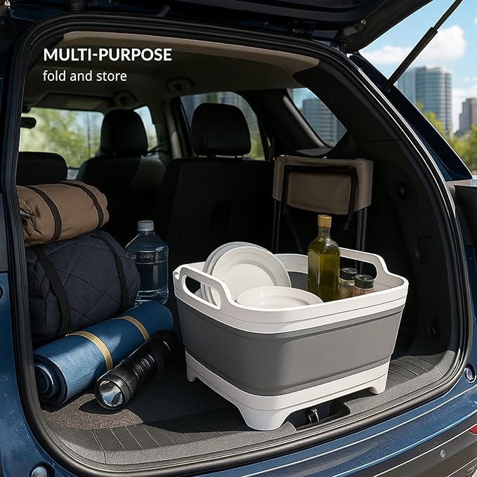 Collapsible Dish Basin - 2.4 Gal (9L) with Drain Plug – Foldable Multiuse Sink Tub for Kitchen, Camping, RV, Dishwashing & Vegetable Washing (Gray)
