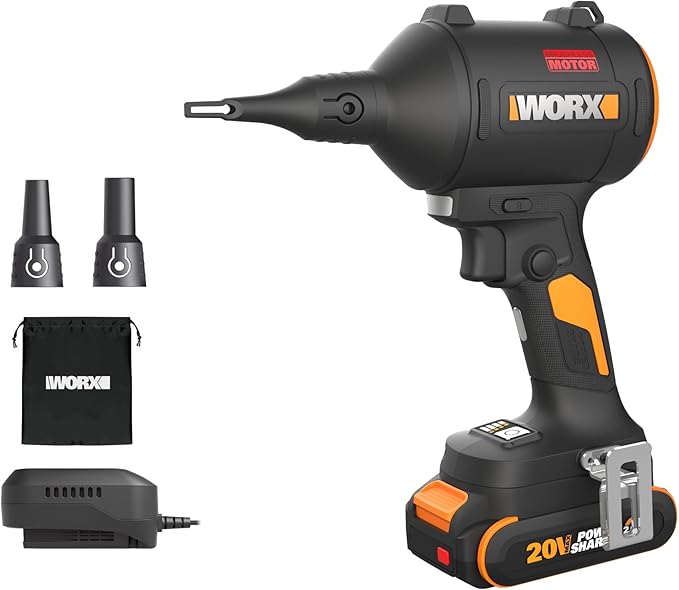 WORX Cordless Blower/Inflator, 20V 39 CFM 470 MPH Brushless High Speed Portable Dust Cleaner for Workshop, Lawn, Yard, Home, Lightweight Handheld Blower, Battery and Charger Included, PowerShare