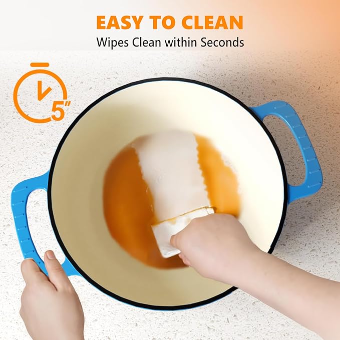 - Easy Cleanup & Added Convenience:The smooth enamel surface resists stains and wipes clean effortlessly with a sponge—no scrubbing needed! Included heat-resistant pads protect your hands when handling hot lids or lifting the pot. Practical and stylish, it’s as easy to maintain as it is to cook with