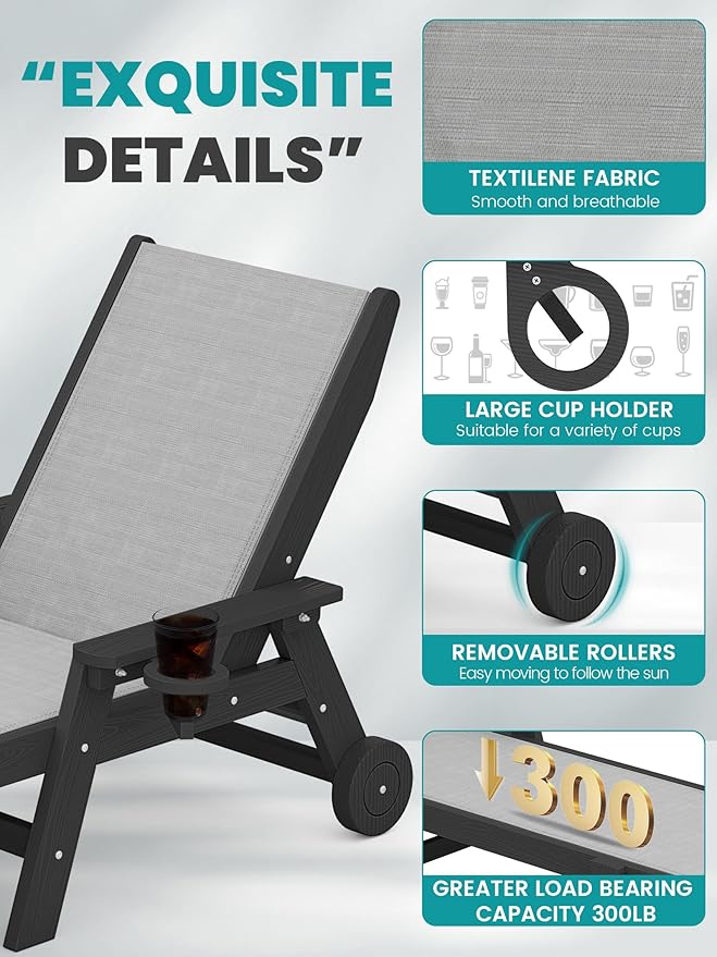 - Rolling Wheels: Equipped with convenient wheels, our chaise lounge chair is effortlessly portable. You can easily move it around to follow the sun or find shade throughout the day, providing you with the flexibility to create your ideal lounging spot.