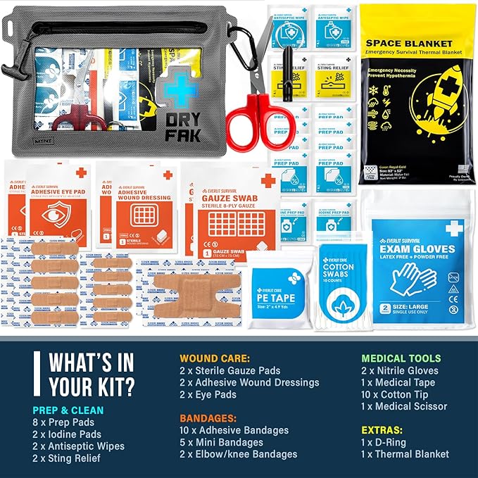- Must-Have Essential for Every Outdoor Adventure: Whether you're hiking rugged trails, paddling downriver, this compact waterproof first aid kit is built to keep you prepared. Trusted by backpackers, it’s the perfect first aid kit for hiking, backpacking, kayaking, fishing, or biking. This personal first aid kit weighs next to nothing but delivers serious peace of mind. Ideal as a hiking medical kit, bike first aid kit, backpack first aid kit, or even a boat emergency kit.