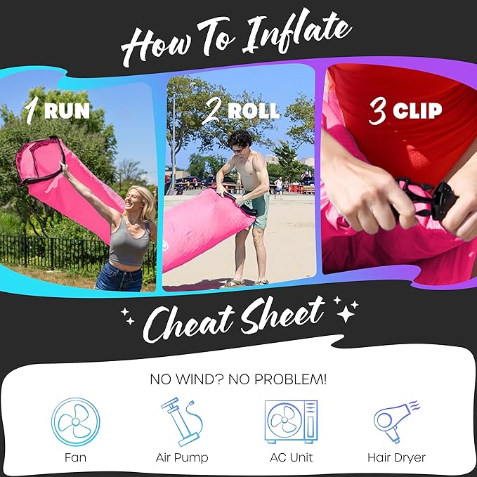 - EASY SETUP INFLATABLE CAMPING COUCH : Our air couch inflatable furniture inflates in a few simple steps—run, roll, & clip to create a compact camping chair . You can also use a fan, hair dryer, or air pump to effortlessly fill your blow up chair for adults & kids. When you're finished, deflate the beach bed air lounger in seconds & store it in the convenient inflatable chair drawstring bag. With the Nevlers Inflatable Beach Lounger , you’re always prepared to kick back, indoors or outdoors.