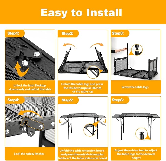 - Heat & Waterproof TOP - Moosinily portable grill table, with 1.6mm steel mesh top covered by powder painting, perform well no matter in heat or in water. The eage of the steel mesh has been polished so it would not be sharp for hands. The thicker 1050A aluminum alloy frame with diameter 25mm is lightweight, anti-corrosion and rust resistant which can use for most outdoor scenes in several year. Thickened Support Rods and the tabletop support rod keep the table stable, this folding camping table has a load capacity of 100 lbs and the table extension board has a load capacity of 30 lbs (evenly distributed)