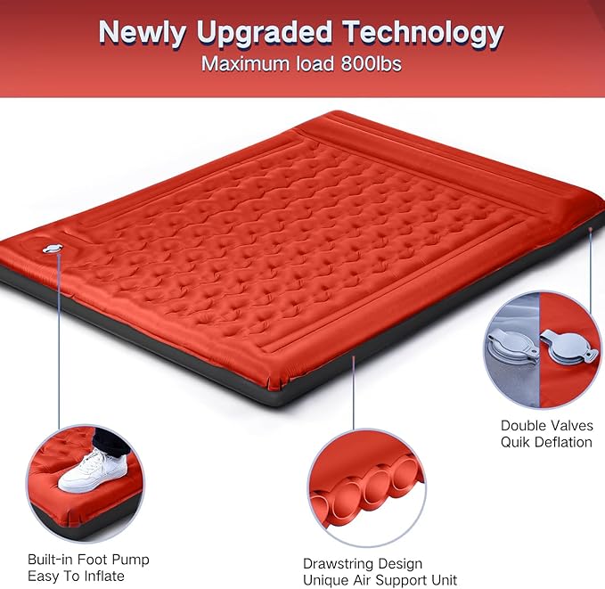 - BUILT-IN FOOT PUMP: No mouth blowing, no extra pump, FNARMW wide sleeping pad features a built-in foot pump. It takes only 3mins to fully inflate this thick queen sleeping pad by foot pressing, no mouth, no hands, clean and hygienic, even kids can finish inflating. Two double layer valves on the pillow can effectively prevent air leakage and achieve rapid deflation, just remember to close the valves tightly before inflation. NOTE: the inflation time depends on the speed of your foot pressing.