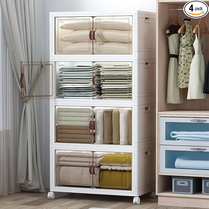 Extra Large Stackable Storage Binswith lids & Wheels, Foldable Collapsible Closet Organizers,480QT-120QT/30GAL*4Pack Plastic Containers with door & drawers for bedroom Dorm