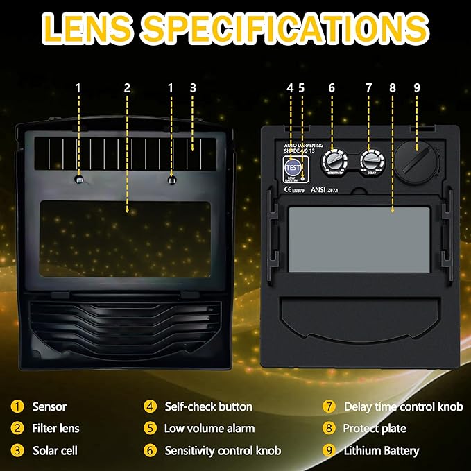 - Auto Darkening Lens – Switches from light to dark in 3/10000 second to protect your eyes from arc flash, UV, and IR radiation.