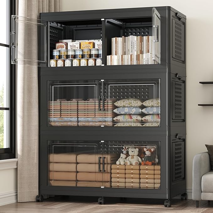 - 【Two Ways to Open & Clear Magnetic Door】The collapsible storage bins with lids and wheels feature a dual access way, allowing for both top and front door openings, and with clear windows for easy visibility. The stackable plastic storage bins with open front doors are equipped with magnetic lock buckles to prevent dust from entering the cabinet.