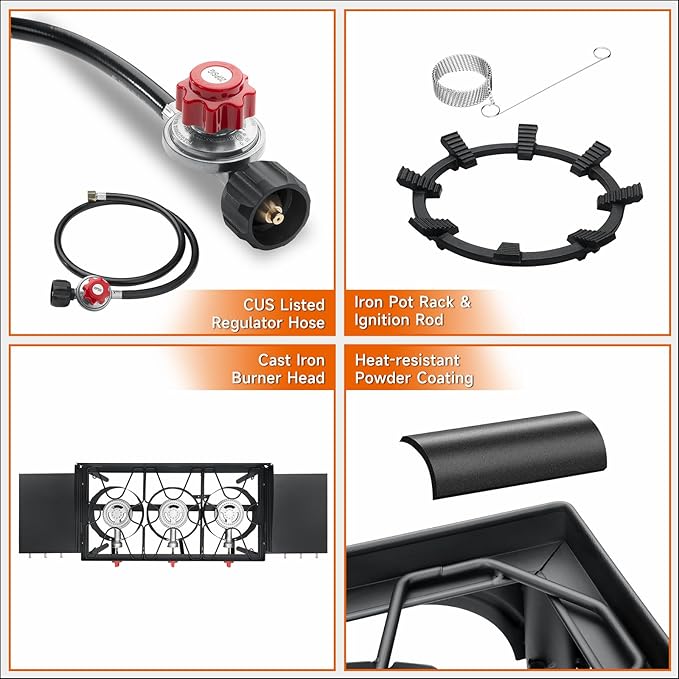 - Premium Heavy-Duty Material: This 3 burner propane stove features a weather-resistant powder-coated finish and reinforced iron construction, delivering unmatched durability for outdoor cooking stoves. Come with CUS Listed Regulator Hose. It's perfect for RV cooking equipment, camping trips, and backyard barbecues.