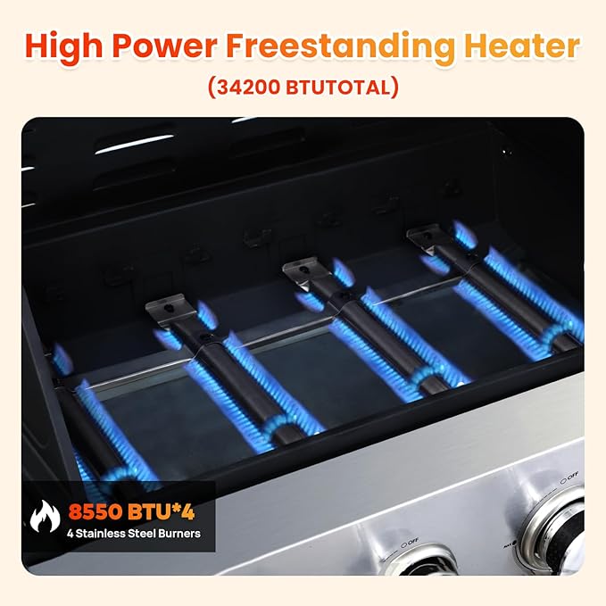 - ๐ฅ High-Performance Stainless Steel Burners - This propane gas grill features 4 powerful stainless steel burners delivering a total of 34,200 BTU per hour. With a built-in piezoelectric ignition system, you can enjoy instant start-upโjust push and turn the control knob. Itโs reliable, efficient, and ready to fire up your outdoor meals in seconds.