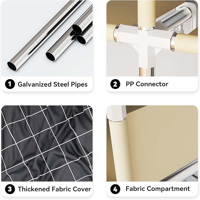 - 【Quick and Simple Assembly】:Say goodbye to complicated setups! Our heavy-duty clothes rack features a straightforward design With a modular design, no professional tools are required. A single person can easily complete the assembly, saving time and effort. The detachable structure makes it convenient to carry or re - position when needed, suitable for users who often move or adjust their home layout. Plus, enjoy peace of mind knowing your metal storage rack won’t scratch your floors.