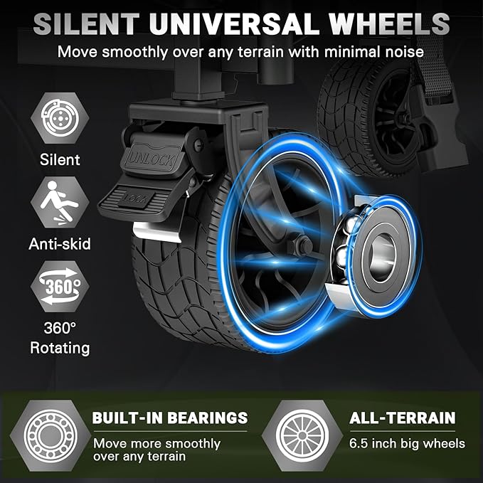 - [All-Terrain 360°Silent Swivel Wheels]Glide smoothly over sand, gravel, grass, or uneven pavement with premium noiseless wheels. The 360-degree rotation provides effortless maneuverability, while the rugged tread design ensures stability on any surface.