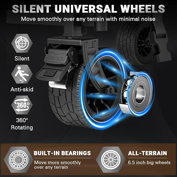 - [All-Terrain 360°Silent Swivel Wheels]Glide smoothly over sand, gravel, grass, or uneven pavement with premium noiseless wheels. The 360-degree rotation provides effortless maneuverability, while the rugged tread design ensures stability on any surface.