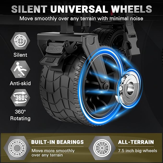 - [All-Terrain 360°Silent Swivel Wheels]Glide smoothly over sand, gravel, grass, or uneven pavement with premium noiseless wheels. The 360-degree rotation provides effortless maneuverability, while the rugged tread design ensures stability on any surface
