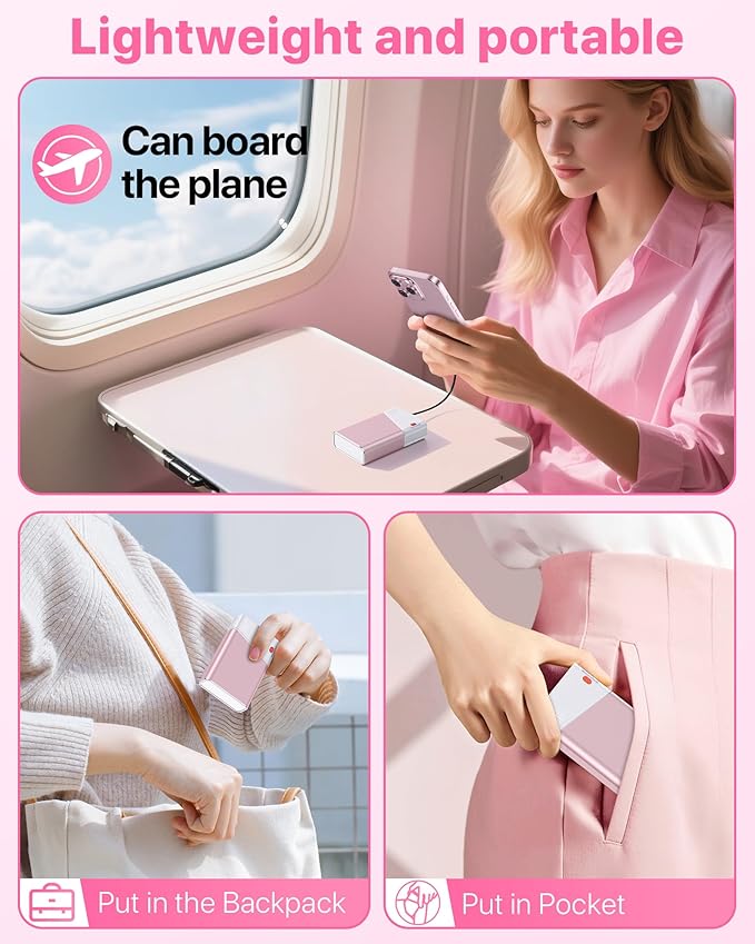 - Built-in Cable – This 20,000mAh portable charger features a built-in Type-C cable, compatible with most cellphones and laptops. This compact power bank is widely compatible with the iPhone series (iPhone, iPad, AirPods), Android devices (Samsung, Google Pixel, Realme, Oppo, Vivo, LG, Motorola), and other electronics like small fans, heating vests, and smart wearables