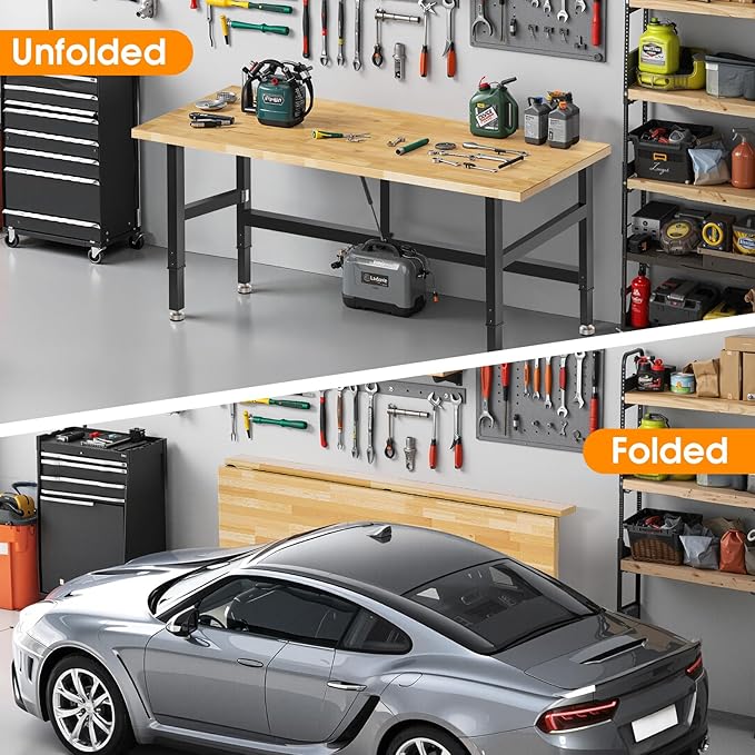 60” Folding Workbench, 2000 LBS Capacity Heavy Duty Workbench, Height Adjustable Foldable Work Table, Rubberwood Collapsible Desk for Workshop, Garage, Office, Home