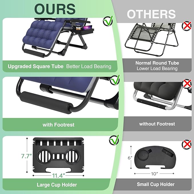 - 【More Sturdy and Durable】Upgraded zero gravity chair can bear 500 pounds. 40mm(1.6inch) Thickened steel pipe can make the chair not shake and more stable, improve the bearing capacity and durability of the patio chair. Upgrade texlin fabric, double elastic bands,breathable mesh and removable soft cushions add extra comfort