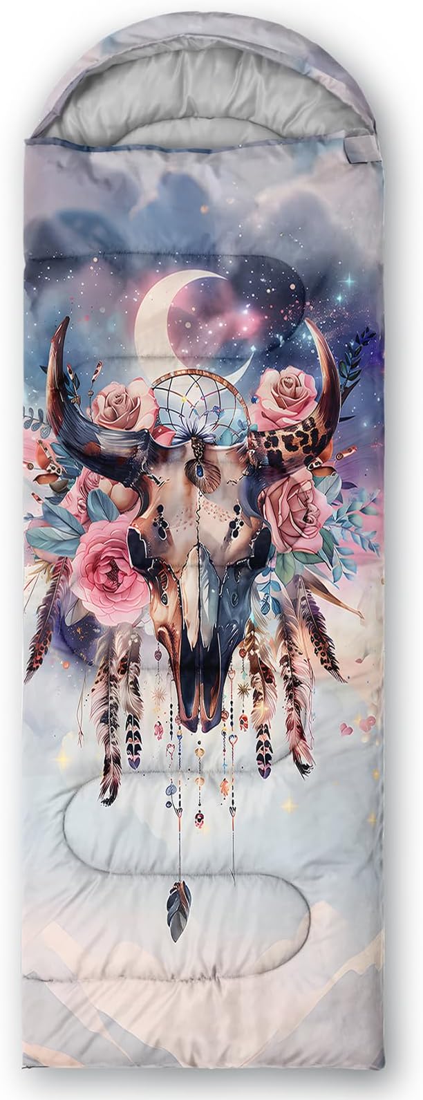- Unique Bull Skull Design:This Bull Skull pattern sleeping bag is made of 3D digital printing with vibrant colors and patterns,size: 31W x 90L inches,temperature range: 32℉-77℉ (0℃-25℃),it also also have a weather resistant waterproof design to keep you warm and prevent you from any dampness,can be used in 3 seasons