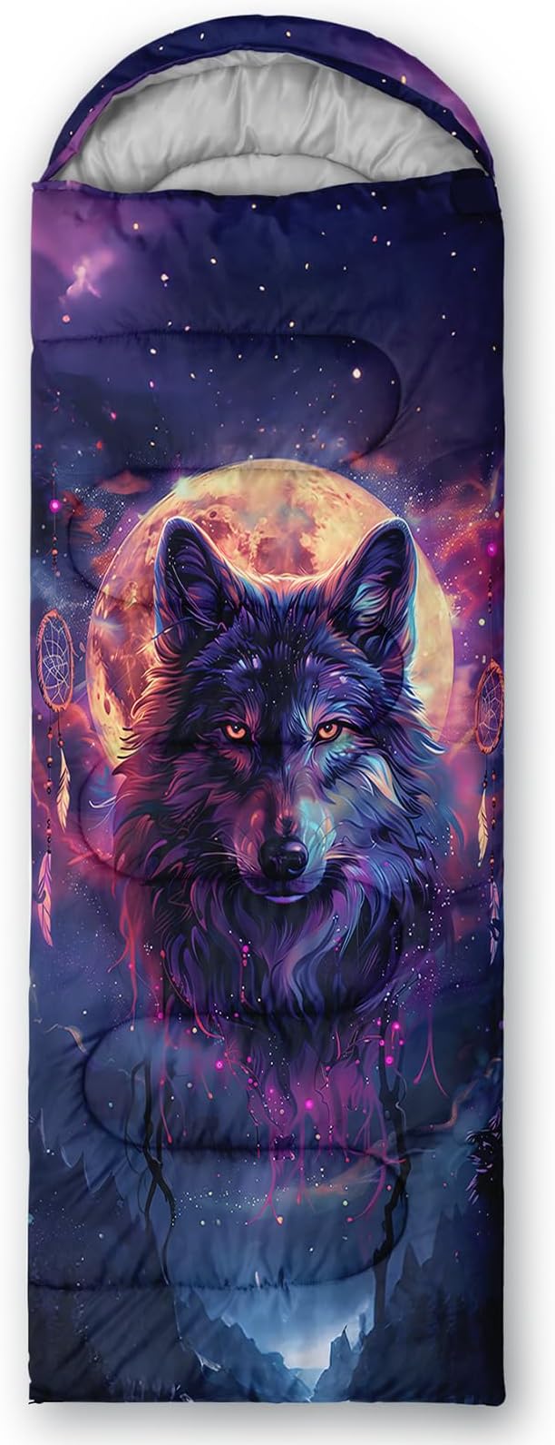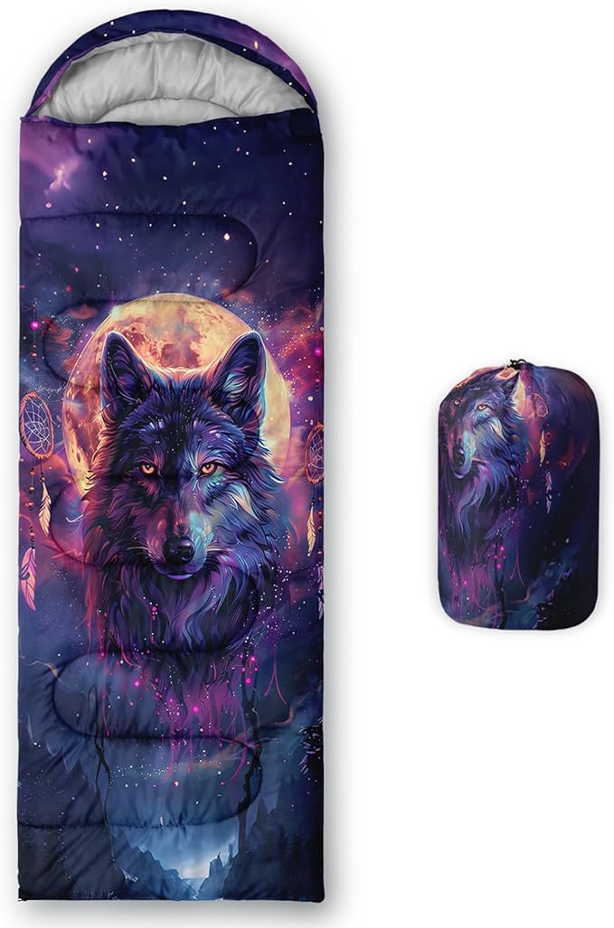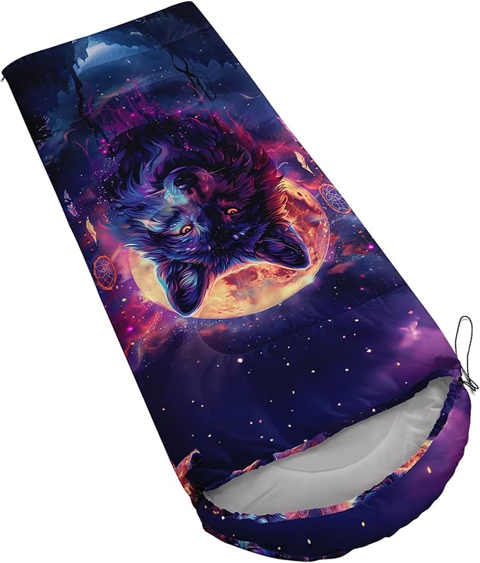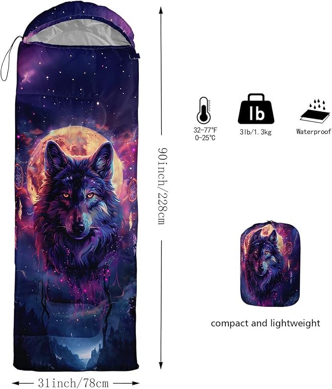 - Unique Wolf Design:This Wolf pattern sleeping bag is made of 3D digital printing with vibrant colors and patterns,size: 31W x 90L inches,temperature range: 32℉-77℉ (0℃-25℃),it also also have a weather resistant waterproof design to keep you warm and prevent you from any dampness,can be used in 3 seasons