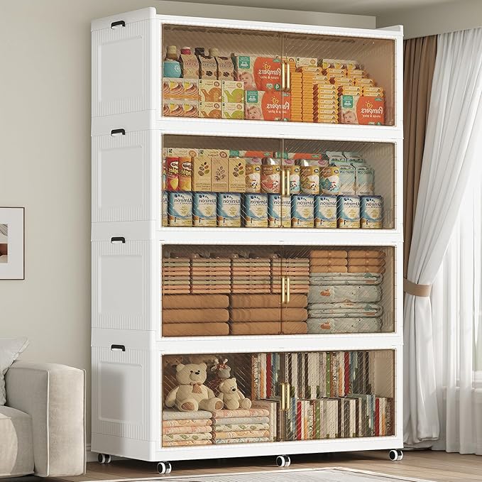 - 【Foldable, Stackable, Quick Assembly】Our large plastic storage bins can be quickly unfolded or collapsed in just 3 minutes to maximize space utilization. It can be stacked layer by layer into a cabinet, with side buckles to secure each level in place, preventing tipping or scattering. An essential large storage cabinet for homes and dorms.