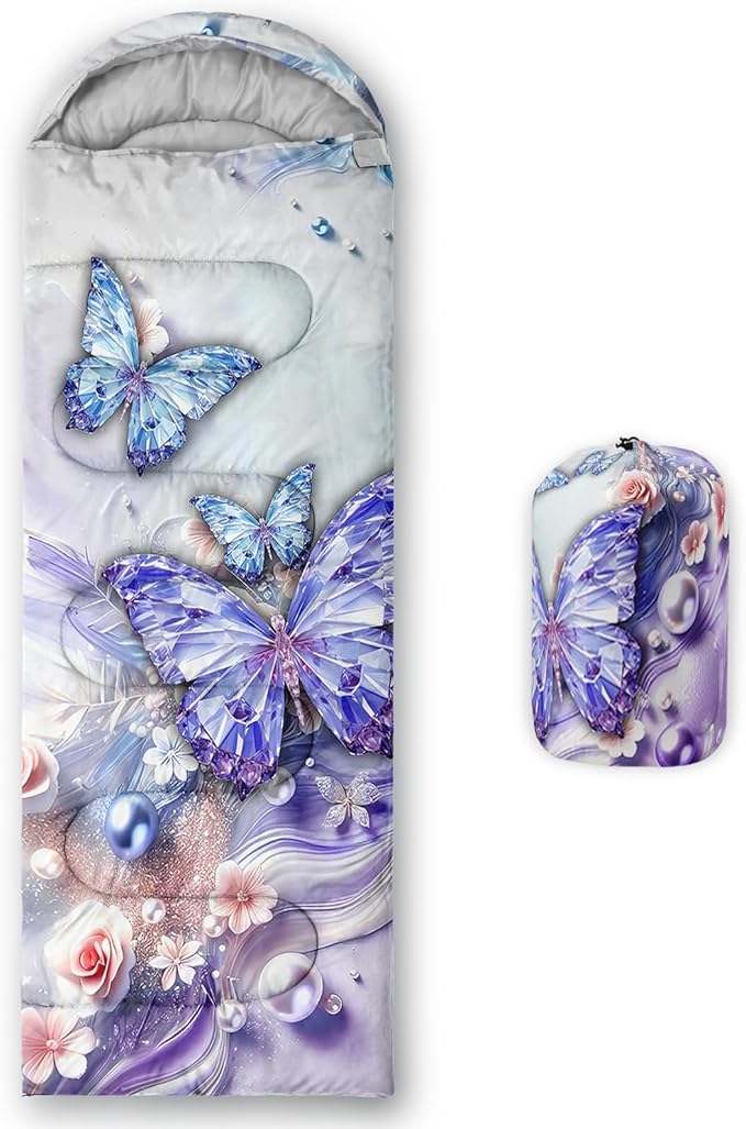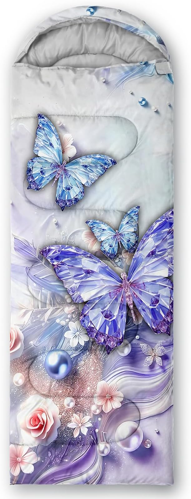 - Unique Butterfly Design:This Butterfly pattern sleeping bag is made of 3D digital printing with vibrant colors and patterns,size: 31W x 90L inches,temperature range: 32℉-77℉ (0℃-25℃),it also also have a weather resistant waterproof design to keep you warm and prevent you from any dampness,can be used in 3 seasons