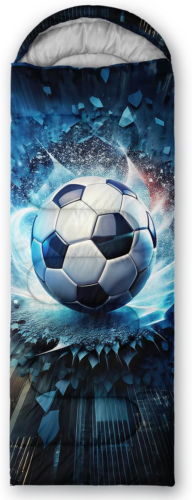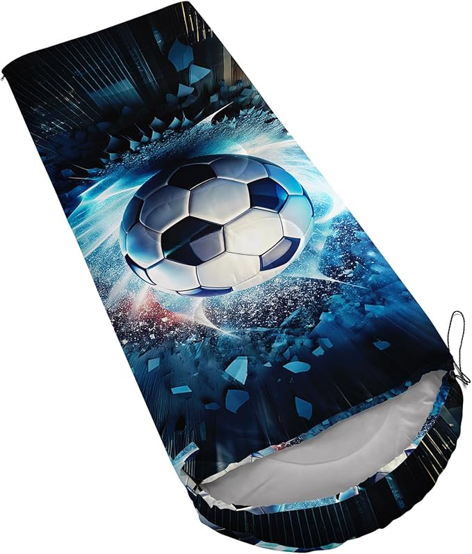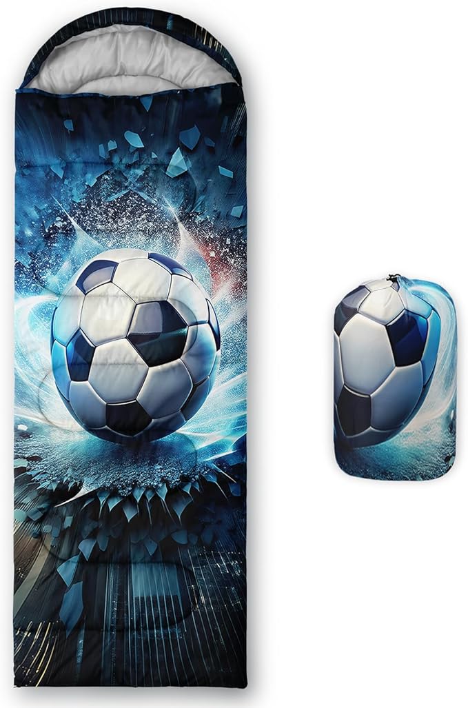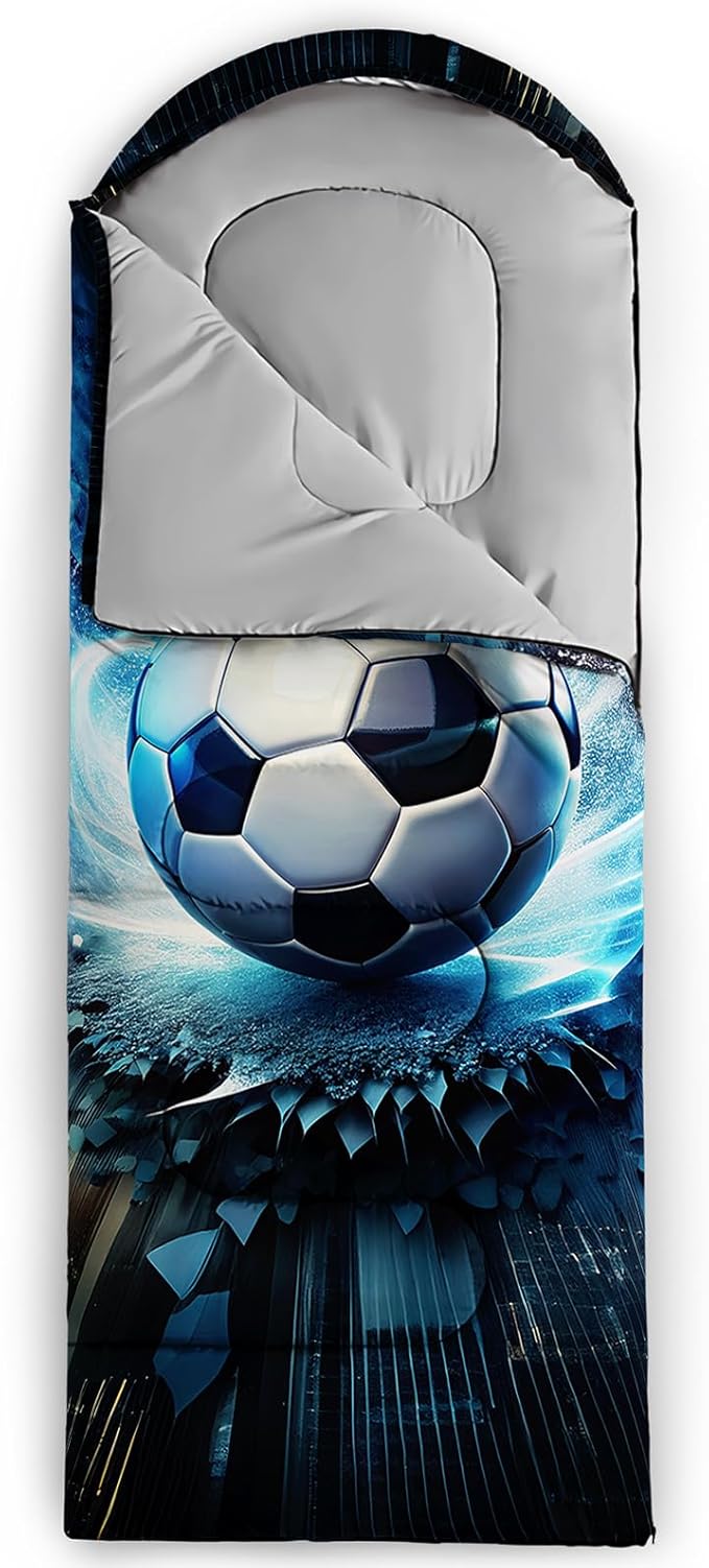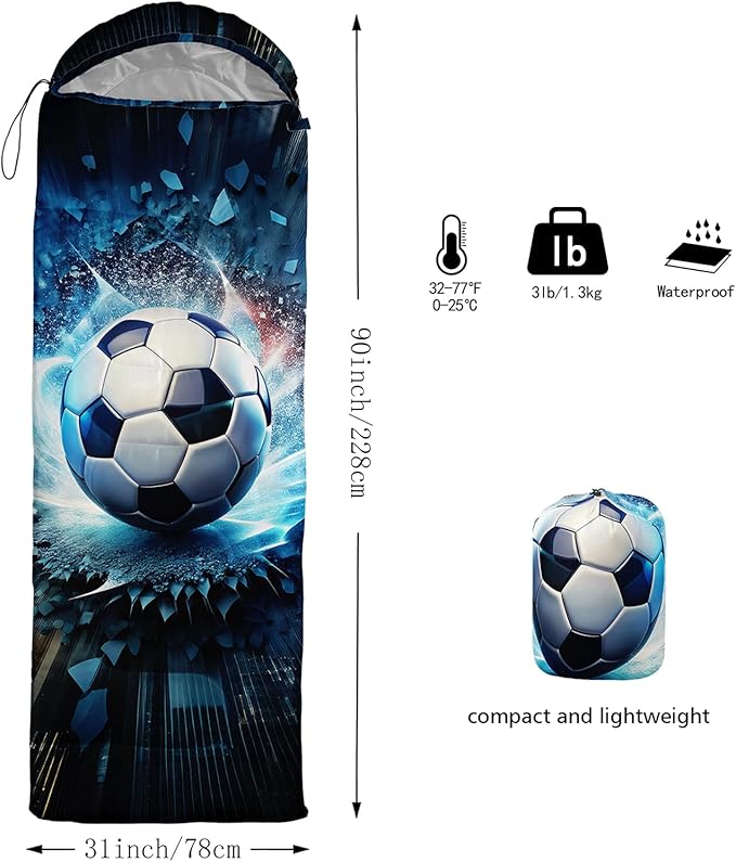 - Unique Soccer Design:This Soccer pattern sleeping bag is made of 3D digital printing with vibrant colors and patterns,size: 31W x 90L inches,temperature range: 32℉-77℉ (0℃-25℃),it also also have a weather resistant waterproof design to keep you warm and prevent you from any dampness,can be used in 3 seasons