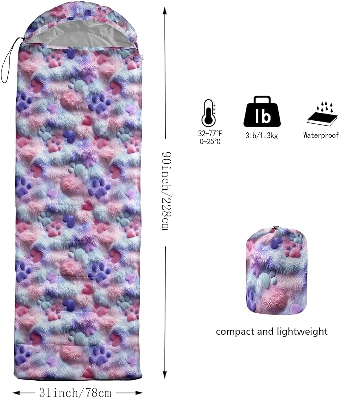 - Unique Rainbow Design:This Rainbow pattern sleeping bag is made of 3D digital printing with vibrant colors and patterns,size: 31W x 90L inches,temperature range: 32℉-77℉ (0℃-25℃),it also also have a weather resistant waterproof design to keep you warm and prevent you from any dampness,can be used in 3 seasons