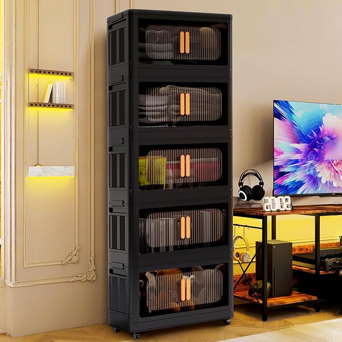 Holaki 320 QT Collapsible Closet Organizers with Lid, Stackable Plastic Storage Bins Cabinet with Wheels and Magnetic Door 5 Pack(Black Larger)