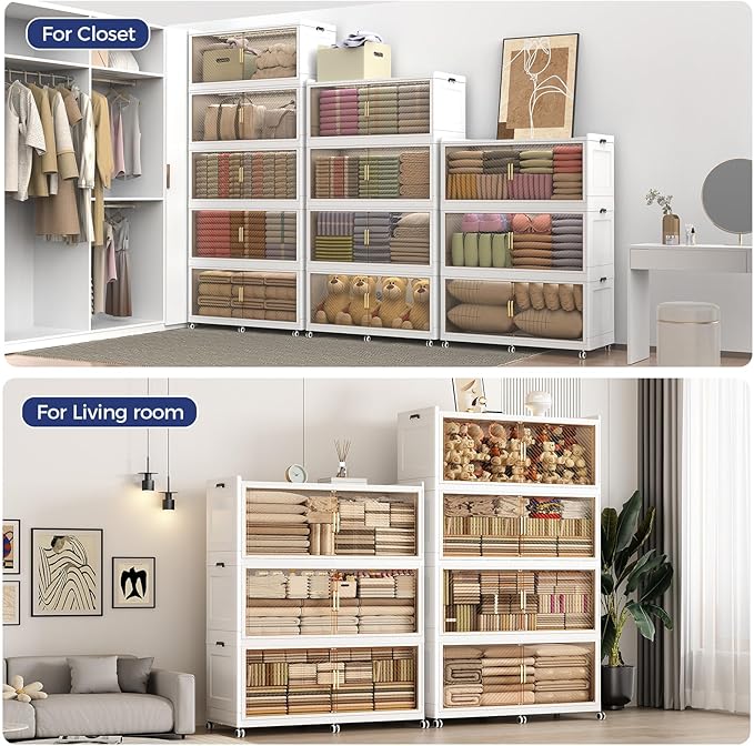 - 【Two Ways to Open & Magnetic Doors】The collapsible storage bins with lids and wheels feature a dual access way, allowing for both top and front door openings, and with clear brown windows for easy visibility. The super huge storage bins with open front doors are equipped with magnetic lock buckles to prevent dust from entering the cabinet.