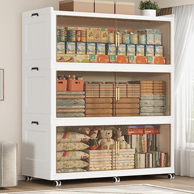 - 【8x Support Rods & 6x Rotating Wheels】Each 3-layer storage cabinet has 4x2 full metal support rods embedded in the bottom and lid. The more heavy-duty foldable storage bins can bear up to 180-220lb, far exceeding other fragile plastic folding storage bins. The wheeled storage bins design with 6x 360-degree rotating wheels, allowing for easy movement.WARNING : CHOKING HAZARD-small parts. Not for children under 36 moths.