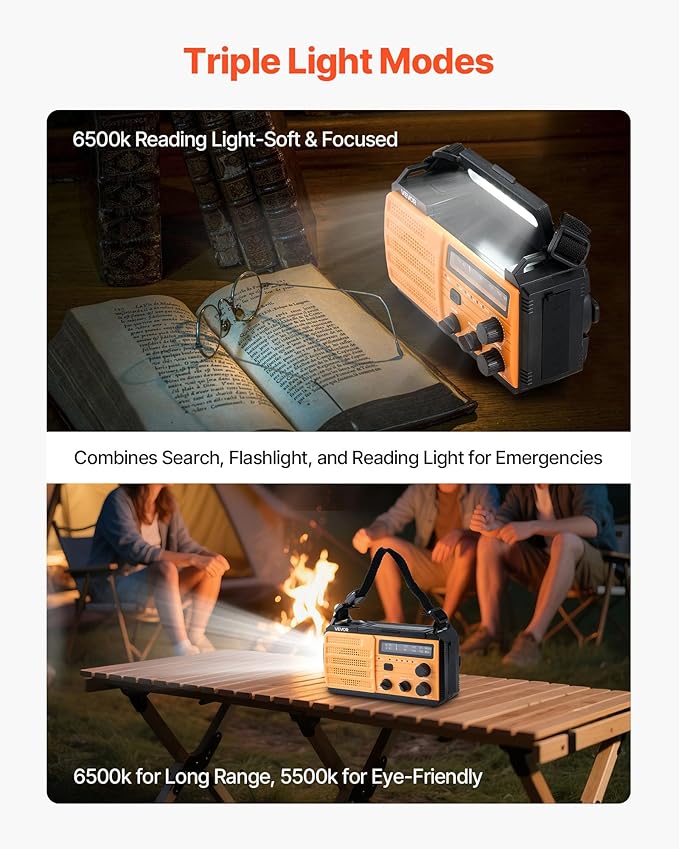 - Three-in-One Lighting: Our emergency radio features 1W high-beam LED for outdoor search, COB low-beam for soft area lighting, and 6 reading lights for eye-friendly tasks. It is ideal for camping, power outages, and night reading